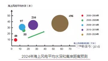 海上风电市场的重心将从浅水区向深水区转移,机组容量大型化成发展趋势 2014年,全球90%以上的海上风机安装在滩涂区或浅水区域,按照国际惯例,海上风电场以内及主风向的上下游数百米至上千米的范围内通常不适宜建设大型结构,并且风机设施附近禁止拖网渔业等捕捞活动,这就大大影响了海洋区域的规划。随着海上风电场规模越来越大,项目数量不断增加,将对全球近海海域的生态环境、经济建设、海上旅游等造成较大影响。未来随着潮间带及近海资源被瓜分殆尽,全球海上风电将不可避免地走向深海,越来越多的海上风电场将选择深水离岸式布局,2014年全球海上风电场平均水深为22米,预计2024年将达到41米。