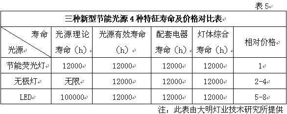 因素四.技术成熟与优良的性价比使T5高效荧光灯成为所有新型节能光源运用之首 根据市场调研和有关资料表明,具备高光效、长寿命、高显色性的新型光源主要是采用三基色荧光粉生产的节能荧光灯、LED和无极灯这三种产品。其中节能荧光灯中包含紧凑型荧光灯和T5双端荧光灯。紧凑型用于替代白炽灯,而T5荧光灯则用于替代T8荧光灯。 表5是根据有关资料和实际使用状况整理的三种新型节能光源的4种特征寿命及相对价格的对照表。