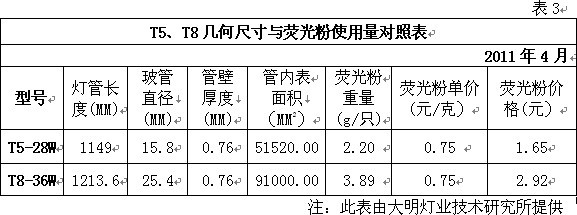 注:此表来源公共机构节能“十二五”规划征求意见稿 我们知道,规划中所说的高效节能荧光灯实际上指的就是国家财政补贴推广的T5荧光灯。有关方面预计此类光源十二五期间将占公共机构单位使用率的50%以上。其它,如紧凑型荧光灯约占25%左右,金卤灯约占15%左右,LED占约10%左右。 由此可见,在公共机构的表率和示范作用下,在国家财政补贴推广举措的带动下,未来T5荧光灯将成为全社会照明领域的主体。 因素三.受产业政策与稀土荧光粉价格飙升的双重影响,T8卤粉荧光灯退出照明行业的速度将加快 根据中国照明电器协会提供的数据表明,目前全球白炽灯、卤粉荧光灯和三基色节能荧光灯的应用比例为4:3:1,我国约为8:9:1。其中三基色节能荧光灯是目前应用技术最成熟的环保节能照明产品之一,也是当前照明领域实施节能减排,加快淘汰白炽灯和T8低效荧光灯,实现节能照明的主要应用和推广对象。大家知道,目前制灯行业将低气压汞蒸汽荧光灯灯管按照荧光粉的成分将其划分为卤粉荧光灯、混合粉荧光灯和三基色荧光灯。卤粉荧光灯的平均寿命在3000-4000小时,混合粉荧光灯的平均寿命在4000-6000小时,而三基色荧光灯的平均寿命最长,在10000小时以上。 我国是世界照明产品生产第一大国。2009年,我国白炽灯产量为27.3亿只,荧光灯产量为35亿只。因此,面对巨大的存量市场和增量市场,全球范围内淘汰白炽灯,推广高效节能荧光灯的举措,将带动我国高效节能荧光灯生产行业的快速发展。预计到2013年,我国白炽灯的产量将下降至14.2亿只,高效节能荧光灯(主要包括T5双端三基色荧光灯在内)的产量将达到70亿只,是目前产量的2.25倍。 同时,早在2008年6月1日,国家发改委、国家质检总局和国家认监委组织制定的《中华人民共和国实行能源效率标识的产品目录(第三批)》开始实施。其中,荧光灯达到3级能效以上才可以销售,达到2级能效才能获得节能认证和国家产业政策支持。国外市场方面,欧盟于2009年9月1日开始执行EUP指令。而按照现有卤粉和混合粉荧光灯的性能指标则很难达到2级能效标准。因此卤粉荧光灯和混合粉荧光灯将逐步退出照明市场。如此,对我国照明行业的发展及其生产企业的重新定位必将产生极其深远的影响。 另外,随着我国资源战略产业结构政策的调整,稀土原矿等产品被列入加工贸易禁止类商品目录。同时随着稀土发光材料市场容量的不断增加,稀土价格涨幅明显加快。目前其价格与2010年同期相比已飙升至2倍以上,业内人士预计未来涨幅还会增加。表3和表4分别是T5、T8几何尺寸与荧光粉使用量对照表及T5荧光灯主要原材料2010年与2011年价格同期对照表。据此试图以T8荧光灯采用三基色粉维护现有产量优势的努力就更是难以实现了。所以说国家产业政策和荧光粉价格的变化将加速T8荧光灯退出照明市场的进程。