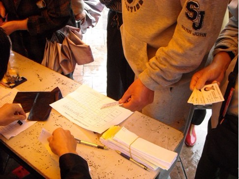 图为:大明灯业推广现场工作前台社区居民持身份证踊跃购买大明T5高效照明产品