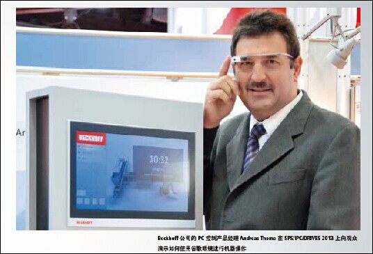 去年在德国纽伦堡举办的“2013 年德国纽伦堡工业自动化及元件展览会(SPS/IPC/DRIVES 2013)上,Beckhoff 展出了通过专注于谷歌眼镜的技术研究开发而成的针对机械操作的最新解决方案。有了具有上网功能的谷歌眼镜,状态或对话消息可以通过一个头戴式显示器直接投射到人眼中。在线信息和通信也可以用这种创新的设备实现,且错误信息可以使用触摸板进行确认。Beckhoff 公司的 PC 控制产品经理 Andreas Thome 坚定地认为,谷歌眼镜是互联网和自动化技术相融合推动工业 4.0 发展的最突出的例子。 Beckhoff 公司的 PC 控制产品经理 Andreas Thome 在 SPS/IPC/DRIVES 2013 上向观众演示如何使用谷歌眼镜进行机器操作。 是什么让谷歌的这些“增强现实眼镜”从竞争中脱颖而出,用作工业环境中的控制元件? Andreas Thome:谷歌眼镜配置包括头戴式显示器、摄像头、麦克风和用作扬声器的骨传导耳机 — 它还配备了振动传感器并在耳机侧面集成了一个触摸板。有了这些功能,谷歌眼镜非常适合用于可视化、诊断和服务,以及技术干预和个人通信。不同于传统的控制理念,该设备属于被称为“可穿戴计算”的创新技术 — 一组每天可以通过用户佩戴来大幅提高其连通性的设备。事实上,很多这些设备现在都已经具有现代智能手机所具备的所有功能。更重要的是,谷歌眼镜型设备使用起来都很方便,因为其半透明遮阳板符合人体工学,且主要都是免提操作。最大的优点在于 — 也着眼于工业自动化 — 现有的移动计算技术可以在我们的感官知觉或我们的肢体动作没有任何限制的情况下使用 — 而且无需电线或电缆。 如何将谷歌眼镜与 PC 控制整合在一起? Andreas Thome:使用 Beckhoff 的 TwinCAT 自动化软件可以将谷歌眼镜与控制技术轻松集成在一起。眼镜与万维网服务器通讯,该服务器提供了通过 TwinCAT 控制的机器状态信息。眼镜接收此状态信息并以信号或错误消息的形式表现出来,甚至还可以指出任何问题的确切位置。确认和复位机器状态等工作也可在现场通过谷歌眼镜完成。 在哪些情况下可以使用此方案? Andreas Thome:潜在的应用场景可以被归类为“直接或间接”。例如,操作人员可以使用眼镜“直接”监控机器或甚至采取行动来直接改变或更正机器状态,而不总是需要在现场完成。对于大型机器和生产设备,操作人员需要在设备周围走动并检查特定临界点的工艺状态值,同时查看设备是运作情况。必要时,操作人员可以采取手动操作,因为双手都是自由的。“间接”选项涉及到信息的收集和保存,不完全依赖于正在运行的进程。这些选项包括,例如,研究制造商有关特定机器组件的文档资料,在 Internet 上搜索信息,并通过电子邮件和支持视频聊天的聊天工具进行人际互动。然而,直接和间接应用的组合也是可能的。即使一台机器正在运行,操作人员也可以与专家联系并通过眼镜将正在运转的机器的视频发送给专家,以咨询一些具体的问题。随后,专家可以给现场操作人员提供技术支持 — 以视频或语音消息的形式 — 这样就可以采取相应的纠正措施。这是被描述为“你看到的就是我看到的”(WYSIWIS)的 IT 概念也可以在工业环境下应用的范例。 静态和动态的机器状态信息可以被投射到谷歌眼镜的头戴式显示器上。 如果出现错误,谷歌眼镜会轻轻振动,提醒操作人员注意出错消息。一旦错误被纠正,该消息可以直接通过增强现实眼镜复位。 有关在日常生活中使用这种新的控制技术有什么新的想法吗? Andreas Thome:有许多不同的方法来实现。例如,维修工程师可以使用集成的摄像头捕捉到电机或限位开关的 QR 码,然后检索有关其功能、历史状态或当前状态的信息。另一个办法是浏览包含机器控制软件相关信息的网站 — 大小为 640×360 像素的分辨率,无需使用鼠标 — 这将是可行的,如果原始资料被格式化为与增强现实眼镜同时使用。操作人员可以查找由制造商定义的计算机设置,然后采取适当的行动。也可以编写在谷歌眼镜上本地运行的特殊应用程序,并能够通过 WLAN 使用如 OPC UA 或 TwinCAT ADS 等协议建立与机器控制计算机的连接。作为谷歌眼镜技术研究的一部分,Beckhoff 提供二进制和模拟变量的实时可视化应用程序作为本地程序。在所有这些情况下,可以显示状态数据(变量,误差)。此外,操作人员可以使用谷歌眼镜来修改设备设置或周期,如开始或停止生产步骤。 未来,谷歌眼镜和类似的增强现实眼镜将取代传统控制面板和操作理念吗? Andreas Thome:不会。凭借其众多的选件,谷歌眼镜是提高操作和控制理念的杰出开发成果,但它并不能够成为一个完整的替代装置来控制机器或生产设施。传统的机械控制终端(带触摸屏或带键盘的显示器)不能完全被取代 — 因为其分辨率更高且可读性更好,而且集成了关键的控制元件,如急停开关或操纵杆。也可以这样说,可以实现基于谷歌眼镜的完整“无接触控制”的愿景。我们发现,未来,最有可能的是传统的接触和创新的非触摸方法的有机结合。请记住,触碰增强现实眼镜的侧面比给出语音命令要快得多。当然,眼镜功能以免提模式激活:它们通过简单向上点头的方式接通。可以通过轻轻点头的方式浏览菜单项,一个特定的项目可以用语音命令来激活。在所谓的幻灯片上显示的启动功能也能通过语音控制。然而,为了实现这个目的,必须进行特殊编程,且必须