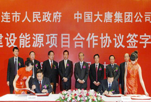 4月27日,大唐集团公司与大连市政府在大连市签订了投资建设能源项目合作协议。集团公司总经理翟若愚、大连市市长夏德仁出席了签字仪式。大连市常务副市长肖盛峰、集团公司副总经理蔡哲夫代表双方在协议上签字。 根据协议,集团公司将为大连市投资建设节能、环保技术和新能源、可再生能源开发等电力项目。大连市政府对投资项目前期工作给予充分的支持,并支持集团公司在与大连港集团合作的基础上,进一步开展合作交流。