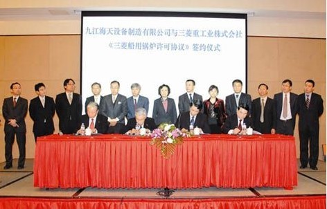 中船集团消息:2月28日,中船集团公司下属的九江海天设备制造有限公司与日本三菱重工业株式会社在上海举行了《三菱船用锅炉许可协议》的签约仪式。这标志着双方的合作正式启动,九江海天将引进日本三菱船用锅炉许可证技术,促进中船集团公司与日本三菱重工的共同发展。 中船集团公司副总经理路小彦在会见日本三菱重工客人时表示,多年来,中船集团公司与日本三菱重工一直有着良好的合作。去年6月,中船集团公司与日本三菱重工签订了船用锅炉合作意向书。经过近半年的交流和洽谈,九江海天与日本三菱重工就引进船用锅炉制造技术达成一致意见。此次锅炉项目的合作不仅填补了中船集团公司船用锅炉配套业务的空白,也标志着中船集团公司与日本三菱重工的合作进入了一个新阶段。相信随着中船集团公司与日本三菱重工的不断发展,双方未来的合作空间将会越来越大。 日本三菱重工原动机事业本部副事业本部长和仁正文在发言中指出,作为日本船用锅炉产量第一的企业,三菱重工拥有先进的技术和管理方式。通过此前的多次交流发现,九江海天不仅在工厂设备、生产能力、品质保证等方面比较过硬,而且工作人员也有较高的技术水平与工作热忱,是非常值得信赖的合作伙伴。为了加强今后的合作,三菱重工将毫无保留地进行技术支援与营销支持,与中船集团公司的造船事业以及九江市的经济共同发展。 据介绍,锅炉产品是九江海天重点开发的产品,这与三菱重工欲在中国做大船用锅炉市场的理念不谋而合。此次双方合作的锅炉产品将主要涉及燃油锅炉、废气锅炉、燃油/废气组合锅炉,蒸发量为2~55蒸吨,其配套范围基本上覆盖了国内的现有市场船型。