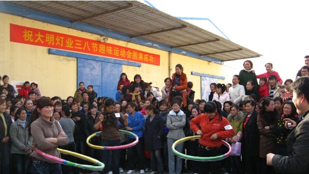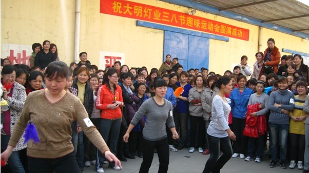 三八节到了,在全国人民都在为这个女性专享的节日而忙活的时候,大明灯业的600多名女职工都在干什么呢? 昨天,也正三八节的下午15:30—17:30分,大明灯业第一届三八节趣味运动会在总厂仓库厂区隆重开赛,100名女职工参加了键球、呼啦圈、跳绳和拔河的四项比赛,在众多观众的欢笑和喝彩中,品质部职工一举夺得跳绳和呼啦圈两个项目的冠军,同时获得拔河亚军和键球季军,以总积分第一的成绩夺得趣味运动会总冠军头衔,7号自动线和二车间分别获得二、三名。