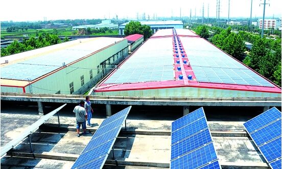 7月14日,三门峡产业集聚区光伏发电项目员工在一家企业屋顶巡检太阳能板。该项目是三门峡首个光伏发电项目,2013年6月投产,装机容量逐步增加到19.5兆瓦。项目利用园区10余家工厂厂房屋顶覆设的太阳能板,发电除满足企业自用外,大部分电量销售给国家电网三门峡供电公司。