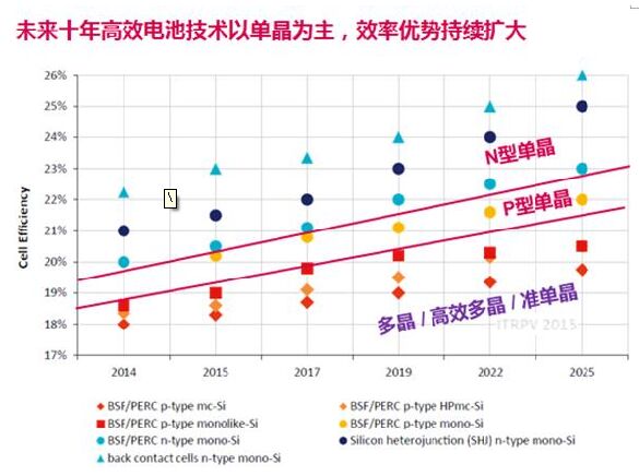 转换效率是领跑者核心标准 对于领跑者计划而言,组件的转换效率无疑是核心要素,领跑者基地建设要求使用高效组件,并提出了明确的数据指标,其中给出的准入标准效率为多晶组件15.5%和单晶组件16%;领跑者效率则分别为16.5%和17%,据业内人士分析,单晶将更容易达到这一标准,而多晶想要达到这一标准,还有一定难度。 在隆基股份旗下乐叶光伏汤应辉先生看来,领跑者计划要求的单晶17%的效率,其组件标称功率60型要达到275W,72型则要达到330W,就国内产能来看,隆基股份旗下乐叶光伏已经实现了量产单晶产品90%以上都能满足这一标准;而多晶16.5%的效率,其标称功率60型要达到270W,72型要达到325W,国内产能达标率不足10%。同时,单晶的理论转换效率也达到25%以上,远高于多晶,对于注重组件效率的领跑者计划来说,单晶无疑更具优势。 未来高效电池技术以单晶为主 随着产业升级的必要,高效电池市场进一步扩大,而转换效率更高、长期收益更好的单晶势必将引领高效电池市场。市场趋势也证实了这一点,2015年以来,中国市场单晶组件用量预计3.5-4GW,出货量达到历史顶峰。中民新能400MW单晶组件订单,北控光伏采购100MW单晶组件,中广核太阳能的100MW,特变电工的200MW订单,中环股份建成了50MW光伏电站……近日,全球最大的单晶硅制造商隆基股份及其旗下乐叶光伏又分别与中民新能、林洋能源、招商新能源、中设无锡等六家公司签下9.6GW单晶组件、3GW单晶硅片/电池片的战略合作协议巨单,单晶重回高效组件市场主导地位的趋势十分明显。 同时,单晶的长期衰减低于多晶也已经成为行业共识,虽然仍有人对单晶的前几个月的初始光衰抱有疑虑,但事实已经证明,单晶的长期衰减性更低、收益更高。对此,隆基股份系统集成总监邓良平正在通过技术手段来改善,“我们现在尝试用有效的办法来降低硅片的含氧量,这一参数控制好了,就能够缓解单晶电池在头几个月的衰减幅度。”邓良平所带领的技术团队还在从多方面降低单晶硅片的成本、提升效率,“金刚线切割已经全面应用在单晶硅片中了,工艺的进步还在不断提升硅片的转换效率,为更高效的电池制作打下基础。” 不论从市场趋势还是从技术角度来看,单晶都拥有更加明显的优势,Bloomberg分析师王潇婷在统计分析了多个主要市场的相关数据后,也表达了她对单晶产品未来前景的信心,“五到十年后单晶组件的装机比例有可能提升至50%。”