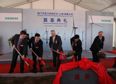 西门子在华首家风机设备制造厂——西门子风力发电叶片(上海)有限公司今天在上海临港区破土动工,作为积极拓展其全球风机生产网络的重要举措,此举标志着西门子正式进军中国风电市场。西门子风力发电叶片(上海)有限公司的初期投资为5.81亿元人民币(6400万欧元);工厂计划于2010年下半年投入运营,届时将更好的满足中国及出口市场对风机设备的大量需求。上海市副市长艾宝俊、西门子股份公司管理委员会成员兼能源业务领域首席执行官戴恩和西门子东北亚业务区首席执行官、西门子(中国)有限公司总裁兼首席执行官郝睿强博士共同为工厂奠基。