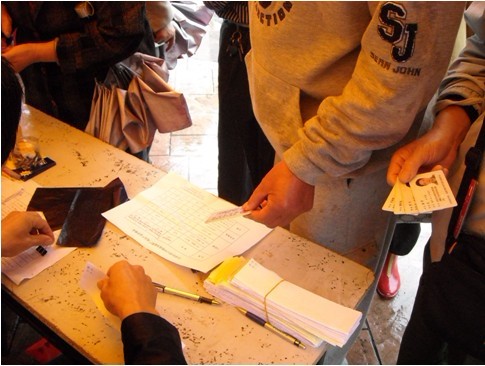 图为:大明灯业推广现场工作前台社区居民持身份证踊跃购买大明T5高效照明产品