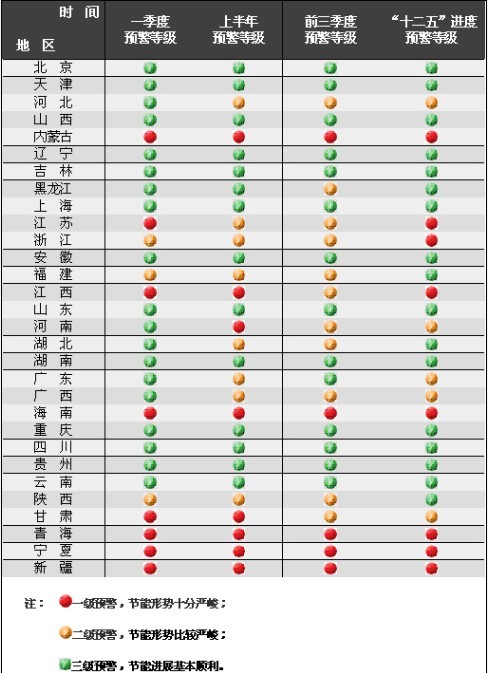 为督促各地做好节能工作,我们建立模型对各地区前三季度单位GDP能耗变化情况进行了预测,并与各地区年度及“十二五”节能目标任务进行了比较分析,确定了各地预警等级,制作了各地区节能目标完成情况晴雨表。 通过分析,内蒙古、海南、青海、宁夏、新疆等5地区预警等级为一级,河北、黑龙江、江苏、浙江、福建、江西、河南、湖北、广西、陕西、甘肃等11个地区预警等级为二级,北京、天津、山西、辽宁、吉林、上海、安徽、山东、湖南、广东、重庆、四川、贵州、云南等14个地区预警等级为三级。西藏缺乏统计数据,没有进行预测。与上半年预测相比,有1个地区预警等级提高,黑龙江由三级预警转为二级预警,节能形势趋于严峻;有4个地区预警等级下降,江西、河南、甘肃由一级预警转为二级预警,广东由二级预警转为三级预警。 与“十二五”节能工作进度要求相比较,内蒙古、江苏、浙江、江西、海南、青海、宁夏、新疆等地区预警等级为一级,河北、河南、广东、广西、甘肃等地区预警等级为二级,北京、天津、山西、辽宁、吉林、黑龙江、上海、安徽、福建、山东、湖北、湖南、重庆、四川、贵州、云南、陕西等地区预警等级为三级;与上半年预测相比,5个地区预警等级下降,福建、湖北、陕西由二级预警转为三级预警,河南、甘肃由一级预警转为二级预警。 现将晴雨表印发,供各地区在工作中参考。 各地区2011年前三季度节能目标完成情况晴雨表