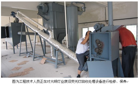 应该指出的是,对于废旧节能灯回收体系的建立,这不是简单一句口号就能完事的,它需要政府的行政政策的支持(制定相关废旧节能灯回收法规及财政补贴政策),也需要广大节能灯生产企业形成回收体系战略联盟,这样就能在政策和可操作性方面得到根本的解决,也增强了企业对消费者负责的社会责任感,真正承担起企业应该承担的社会责任,为消费者的安全健康和绿色环保人居环境而出一份力,尽一份责。 四.大明灯业废旧荧光灯处理系统介绍 2011年7月底,由本公司技术中心与沙市大学机械自动化学院共同研制的废旧荧光灯回收处理设备已投入试运行,废旧灯管经本装置处理后,汞被活性炭吸附,吸附有汞的活性炭再送至专业回收机构进行汞回收,使汞不对环境造成污染。而灯管的玻璃、荧光粉及其它金属等也都得到100%的回收利用。