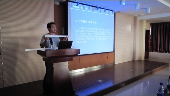 图为大明灯业高效照明产品推广项目部办公室主任朱司凤向推广人员讲解推广流程及国家对推广工作的要求及规定