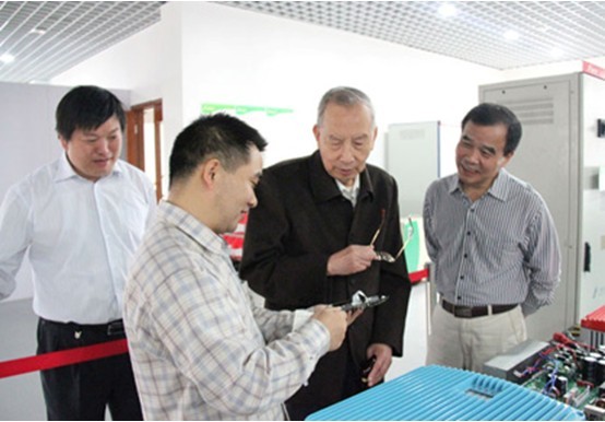 中国电工技术学会名誉理事长、原机械工业部副部长沈烈初(右2)在追日电气企业技术中心了解光伏逆变器开发情况