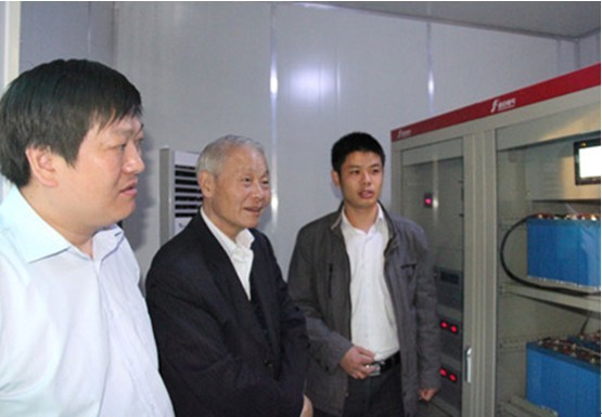 中国电工技术学会名誉理事长、原机械工业部电工局局长周鹤良(中)在光伏发电、 充电示范项目现场考察追日电气自主开发的电池能量管理系统