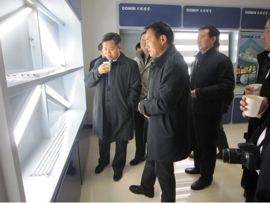 2012年3月3日上午,中国节能环保集团公司总工程师企业管理部主任邹结富、荆州发改委主任肖夕映、荆州开发区管委会主任罗清洋等领导一行,在荆州大明灯业有限公司董事长倪功大、总经理池昌明等部门经理的陪同下,深入到大明灯业进行实地考察。中国节能环保集团在湖北投资了10 多个项目,总投资有几十亿元,其中在荆州有投资过亿元的荆州市城乡生活垃圾收运及固体废弃物处理工程项目,中国节能环保集团此次到荆州来,就是要多了解荆州的产业政策、相关项目和资源开发的情况。  董事长倪功大向中国节能环保集团公司总工程师企业管理部主任邹结富(左一) 一行介绍T5产品