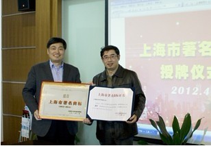 4月11日,上海市普陀区工商局举行了2012年“上海市著名商标”授牌仪式,追日电气以“追日”为商标的软起动和滤波器产品连续两届获得该殊荣。图为追日电气副总裁李如新(左)从普陀区工商局领导手中接过了证书和奖牌。
