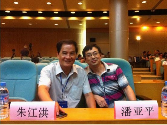 会间,瀚艺集团总裁潘亚平(右)与格力原董事长朱江洪(左)亲切交谈并合影留念