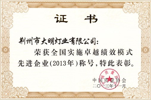 2013年11月3日,第十三届全国追求卓越大会颁奖典礼在北京京西宾馆顺利召开,荆州市大明灯业有限公司荣获全国实施卓越绩效模式先进企业称号,成为荆州市此次唯一受到该项表彰的企业。 荆州市大明灯业有限公司是一家以生产各类照明产品的高新技术企业。自导入卓越绩效模式以来,大明灯业一直致力于技术水平和管理水平的提升,通过学习和时间卓越绩效模式,积极探索,开拓创新,经过不懈努力,取得了显著成效。此次获得该荣誉,代表着大明灯业的管理水平已经达到了一个新的高度,极大地促进了企业的经营质量水平和综合竞争能力,树立了全国实施卓越绩效模式的先进典型。 在此次表彰后企业会坚持持续改进,努力超越自我,不断提高产品、服务和经营质量,增强核心竞争力,继续为提高我国的综合国力做出贡献。
