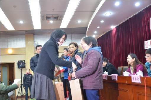 图片注释: 倍福中国人事行政部经理仝红艳向社区受助群众送上慰问金和节日礼品
