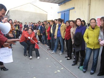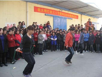 三八节到了,在全国人民都在为这个女性专享的节日而忙活的时候,大明灯业的600多名女职工都在干什么呢? 昨天,也正三八节的下午15:30—17:30分,大明灯业第一届三八节趣味运动会在总厂仓库厂区隆重开赛,100名女职工参加了键球、呼啦圈、跳绳和拔河的四项比赛,在众多观众的欢笑和喝彩中,品质部职工一举夺得跳绳和呼啦圈两个项目的冠军,同时获得拔河亚军和键球季军,以总积分第一的成绩夺得趣味运动会总冠军头衔,7号自动线和二车间分别获得二、三名。