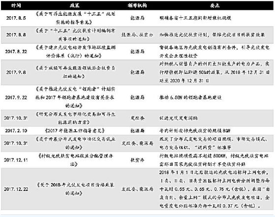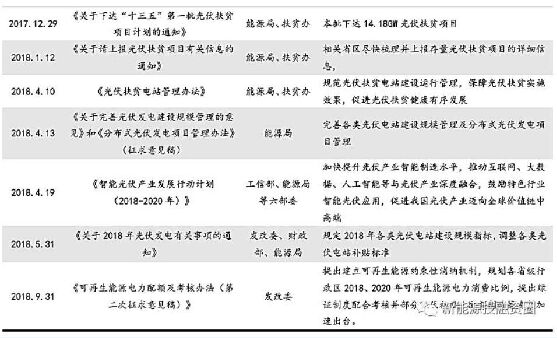 光伏制造各环节成本持续下降,平价上网即将来临。2018H1,硅料、硅片、电池片、组件环节的制造成本(含税)已降至65.00 元/kg、3.45 元/片、1.31 元/W、2.27 元/W,系统成本约5.4 元/W。补贴退坡倒逼光伏制造企业通过产能扩张和技术进步不断降低生产成本,平价上网即将来临。平价上网假设下,光伏各环节成本将进一步下降,硅料、硅片、电池片、组件环节的制造成本(含税)分别约为45.00元/kg、2.10元/片、0.77 元/W、1.56元/W,系统成本约3.29元/W。 531 政策短期冲击明显,有利于推动平价上网。2018年5月31日,三部委联合发布《关于2018年光伏发电有关事项的通知》,政策影响主要体现在以下两个方面:从短期来看,指标限制导致我国2018 年光伏装机需求下滑。根据政策安排,2018年暂不安排通光伏电站指标,安排10GW左右规模用于分布式光伏项目。从中长期来看,光伏补贴退有望推动平价上网加速实现。政策规定,自发文之日起,新投运的光伏电站标杆上网电价每千瓦时统一降低0.05元;新投运的、采用“自发自用、余电上网”模式的分布式光伏发电项目,全电量度电补贴标准降低0.05元。光伏补贴退坡能够推动企业通过技术进步降低成本,光伏平价上网即将到来。 配额制即将落地,或将助力平价上网加速。2018年9月,发改委下发《可再生能源电力配额及考核办法(第二次征求意见稿)》,提出建立可再生能源约束性消纳机制,规划各省级行政区2018、2020年可再生能源电力消费比例,对保障小时数以内的集中式风电、光伏电量以及其他非水可再生能源发电量施行全额保障性收购(考虑技术等限制因素最多限电5%)。配额制若能落地,必将提高光伏电站年利用小时数,进一步降低度电成本,助力平价上网加速。近期光伏政策一览表如下: