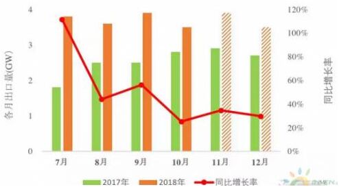 图:2017、2018年下半年各月组件出口量及增长率