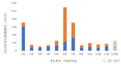 2018年12月20日,中电联公布了《2018年1-11月份电力工业运行简况》,并介绍: 全国基建新增装机容量同比减少,其中太阳能发电和火电新增装机减少较多。 1-11月份,全国基建新增发电生产能力9877万千瓦,比上年同期少投产1458万千瓦。其中, 水电713万千瓦、火电3017万千瓦、核电596万千瓦、风电1720万千瓦、太阳能发电3822万千瓦。 水电、火电和太阳能发电比上年同期少投产314、909和1043万千瓦,核电和风电分别比上年同期多投产379和420万千瓦。 全国太阳能发电设备平均利用小时1148小时。 之前15省公布了大量项目要赶在12月底实现并网,考虑到这部分的装机规模,因此,预期2018年的全年装机规模约为40.5GW,各月的装机规模如下。其中,12月为预测值。