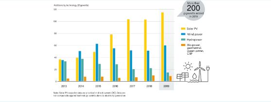 近日,全球可再生能源权威平台——REN21发布了《 2020年全球可再生能源状况报告》(GSR2020)。报告称,2019年全球新增可再生能源装机容量超过200GW,其中光伏占比最高,新增装机量达到115GW,同比增长12%。截止至2019年底,光伏累计装机容量达到627GW。