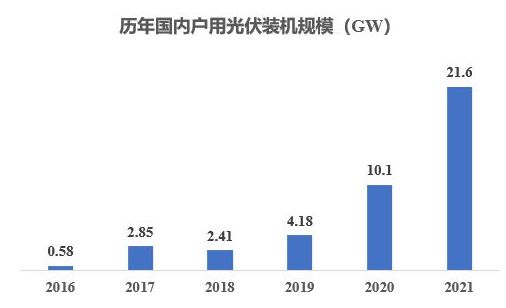 2019年以来,户用光伏被给予单独的补贴,得到快速的发展。从2018年开始,装机规模几乎每年翻一番,详见下图。